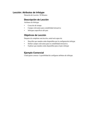 Este documento describe los atributos y opciones de configuración de infotypes en SAP. Explica que los infotypes agrupan datos similares y pueden configurarse con atributos como campos relevantes para la contabilidad retroactiva y visibilidad específica por país. Además, describe cómo personalizar las interfaces de usuario de infotypes y crear menús de infotypes para acceder a la información. El objetivo general es enseñar a los usuarios a identificar y modificar las opciones de configuración de infotypes para controlar la presentación y