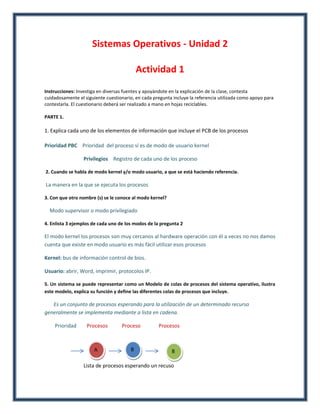 Este documento presenta una actividad sobre subprocesos en Java y C. Se pide crear programas que generen 2 y 4 subprocesos usando hilos, ejecutarlos varias veces y comentar los resultados. También se pide agregar comentarios descriptivos en el código, mostrar la ejecución e incluir instrucciones para visualizar el nombre del programa. Finalmente, se propone un algoritmo de cajero automatizado y un ejercicio sobre deadlocks entre procesos.