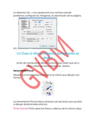 Este documento describe las herramientas de diseño en Adobe Flash para crear y editar dibujos. Explica cómo configurar la página, usar las herramientas de pincel, lápiz, formas, pluma y papel cebolla. También cubre cómo convertir objetos en símbolos, importar y exportar imágenes, y separar dibujos e imágenes en un programa de diseño.
