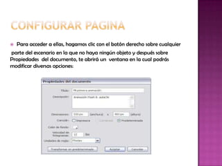 El documento proporciona instrucciones sobre cómo importar y exportar imágenes en Adobe Flash, crear símbolos gráficos, y usar las herramientas Lápiz y Selección. Explica cómo importar una imagen al escenario, convertir un objeto en un símbolo gráfico, y exportar un símbolo como una imagen. También describe los diferentes modos de la herramienta Lápiz y cómo usar la herramienta Selección.