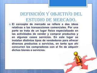 El documento presenta una introducción al estudio de mercado, incluyendo la definición de mercado y objetivo del estudio. Luego describe elementos clave como la identificación del producto, segmentación del mercado, análisis de la demanda y la oferta, análisis de precios, y la comercialización del producto. Finalmente, cubre técnicas para recopilar información y conclusiones sobre la importancia del estudio de mercado.