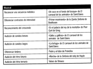 Este documento presenta los fundamentos de la educación musical en la educación temprana. Explica que la educación musical involucra actividades que permiten a los niños desarrollar su voz, oído y sentido rítmico a través de canciones, instrumentos, movimiento y audición de obras musicales. También provee ejemplos de planes de clase y experiencias musicales apropiadas para niños en edad temprana.