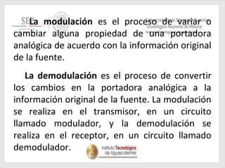 Este documento trata sobre los fundamentos de la modulación y demodulación. Explica que la modulación varía alguna propiedad de una portadora analógica de acuerdo con la información original, mientras que la demodulación convierte los cambios en la portadora a la información original. Luego describe diferentes tipos de modulación como la amplitud, frecuencia y fase. También cubre conceptos digitales como multiplexado, demultiplexado, modulación por pulsos y más.