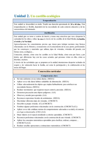 Este documento presenta una unidad didáctica sobre castillos ecológicos. La unidad se desarrollará en otoño durante 30 a 40 días y se centrará en la familia, la casa, el otoño y la Navidad. Los niños aprenderán sobre castillos medievales, tipos de viviendas, profesiones relacionadas con la construcción y características del otoño. La unidad cubrirá objetivos relacionados con el desarrollo personal, el entorno social y las habilidades comunicativas y matemáticas de los estudiantes.