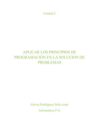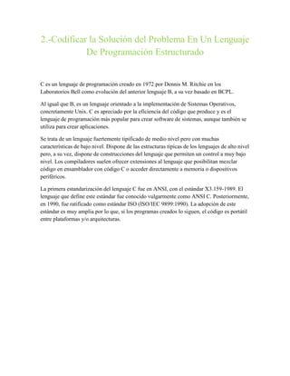 El documento habla sobre los principios básicos de la programación estructurada en lenguajes de programación como C. Explica las tres estructuras básicas de control de flujo: secuencia, selección e iteración. También describe elementos del lenguaje C como variables, tipos de datos y estructuras básicas como condicionales y bucles.