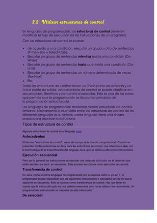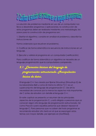 El documento describe los pasos para la construcción de programas, incluyendo 1) diseñar el algoritmo, 2) codificar sistemáticamente las instrucciones en un lenguaje de programación, y 3) ejecutar y validar el programa. También discute elementos básicos de lenguajes de programación como C++, así como el uso de estructuras de control para modificar el flujo de ejecución de un programa.