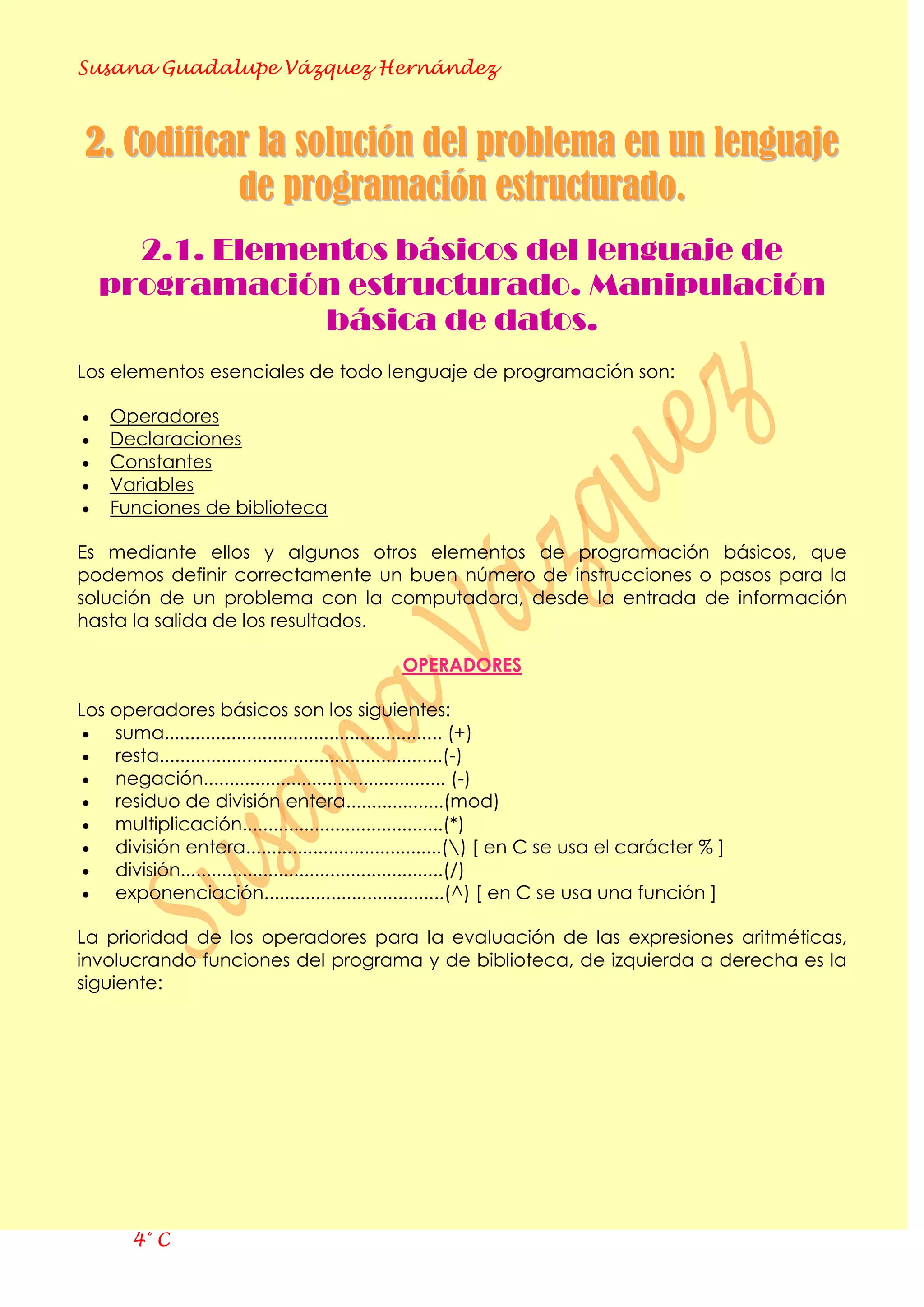 El documento describe los elementos básicos de un lenguaje de programación estructurado como operadores, declaraciones, constantes, variables y funciones de biblioteca. Explica las diferentes estructuras de control como if/else, for, while y do/until que permiten modificar el flujo de ejecución de un programa. También cubre conceptos como tipos de datos, variables y funciones en lenguajes de programación como C++.