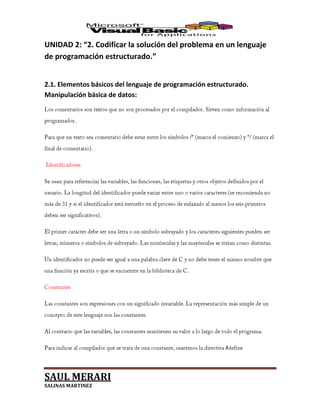 El documento describe los elementos básicos de un lenguaje de programación estructurado, incluyendo la manipulación de datos y el uso de estructuras de control. Se enfoca en la codificación de soluciones a problemas en un lenguaje de programación.