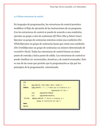 El documento habla sobre los elementos básicos del lenguaje de programación estructurado C++. Explica que C++ es un superconjunto del lenguaje C creado por Bjarne Stroustrup. También cubre las estructuras de control como if/else, loops como for y while, y cómo estas permiten seguir los principios de programación estructurada.