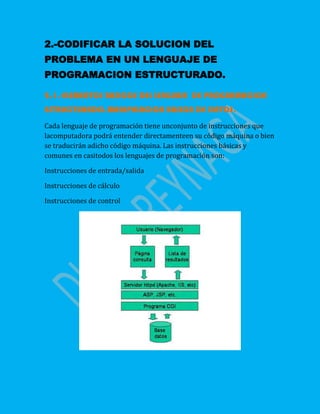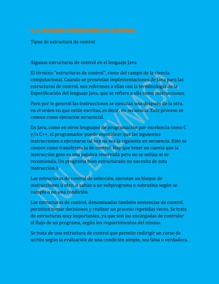 El documento describe los elementos básicos de un lenguaje de programación estructurado como instrucciones de entrada/salida, cálculo y control. Explica que las estructuras de control permiten especificar que las instrucciones siguientes no se ejecuten secuencialmente sino que se transfiera el control. Menciona algunas estructuras de control como la selección que ejecuta bloques de instrucciones según si una condición es verdadera o falsa, y que las estructuras de control permiten tomar decisiones y repetir procesos.