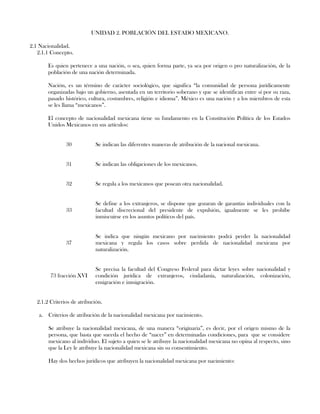 Este documento describe la nacionalidad mexicana y los criterios para su atribución. Explica que la nacionalidad mexicana se puede obtener por nacimiento o por naturalización. Para la nacionalidad por nacimiento, una persona es mexicana si nace en territorio mexicano o si al menos uno de sus padres es mexicano. La nacionalidad por naturalización se puede obtener de forma voluntaria ordinaria o privilegiada, o por consecuencia de los padres. Finalmente, la nacionalidad mexicana por nacimiento nunca se puede perder, mientras que la