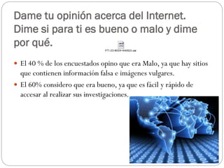 El documento resume los resultados de una encuesta sobre el uso y percepciones del Internet. La mayoría de los encuestados consideran que el Internet es bueno para investigaciones aunque algunos ven sitios con información falsa o imágenes vulgares. Los jóvenes usan el Internet principalmente para tareas, música y juegos mientras que los adultos lo usan para trabajo e investigaciones.