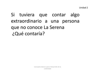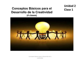 El documento presenta conceptos básicos sobre el desarrollo de la creatividad a través de 4 clases. Explica que la creatividad implica pensamiento original, imaginativo y que ofrece soluciones a problemas. También describe habilidades como la fluidez, flexibilidad y originalidad en el proceso creativo, así como bloqueos cognitivos, emocionales y culturales que pueden impedir la creatividad. Finalmente, incluye ejemplos prácticos para desarrollar la observación y pensamiento creativo.