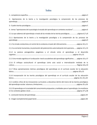 Este documento resume las principales teorías psicológicas del aprendizaje, incluyendo las aportaciones de Vygotsky sobre el aprendizaje mediado socialmente, la epistemología genética de Piaget sobre el desarrollo cognitivo, y la teoría del aprendizaje significativo de Ausubel. Explica brevemente cada teoría y cómo se reflejan en el aula, con un enfoque en el papel del maestro y el alumno. El documento provee un marco para entender los procesos de aprendizaje desde