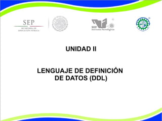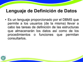 El documento habla sobre el lenguaje de definición de datos (DDL) en MySQL. Explica que el DDL permite a los usuarios definir las estructuras para almacenar datos y consultarlos. Luego describe los diferentes tipos de datos numéricos, de fecha, cadenas y algunas instrucciones básicas como create, select y update que se pueden usar en MySQL.