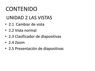 Este documento describe las diferentes vistas y herramientas de presentación en PowerPoint. Explica cómo cambiar entre la vista normal, clasificador de diapositivas y zoom, y cómo usar la cinta de opciones y accesos directos para alternar entre vistas. También cubre cómo usar el clasificador de diapositivas para organizar una presentación y cómo iniciar una presentación de diapositivas.