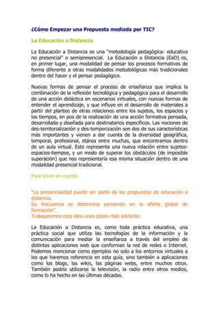 Este documento describe los conceptos clave de la educación a distancia y las modalidades de enseñanza mediada por tecnología. Explica que la educación a distancia utiliza las TIC para mediar la enseñanza a través de Internet y propone formas específicas de interacción entre estudiantes y profesores de manera no presencial. Luego describe tres modalidades: extended learning, que extiende la enseñanza presencial mediante tecnología; blended learning, que combina enseñanza presencial y a distancia; y educación