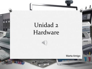 El documento describe los componentes hardware de un ordenador, incluyendo la unidad central, periféricos, tipos de ordenadores, y dispositivos de entrada, salida y almacenamiento. Explica que el hardware son los componentes físicos como la placa base, microprocesador, memoria y discos, mientras que el software incluye el sistema operativo y programas. También describe varios componentes internos como la CPU, memoria, tarjetas y puertos, así como periféricos externos como monitores, impresoras y dispositivos de almacenamiento.