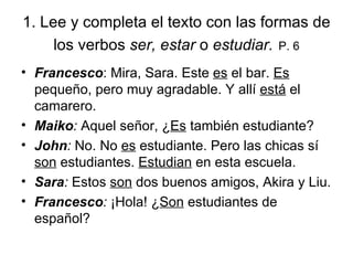 1. Leey completa el texto con las formas de los verbos ser, estar o estudiar. P. 6 Francesco : Mira, Sara. Este es el bar. Es pequeño, pero muy agradable. Y allí est á el camarero. Maiko : Aquel señor, ¿ Es también estudiante? John : No. No es estudiante. Pero las chicas s í son estudiantes. Estudian en esta escuela. Sara : Estos son dos buenos amigos, Akira y Liu. Francesco : ¡Hola! ¿ Son estudiantes de español?