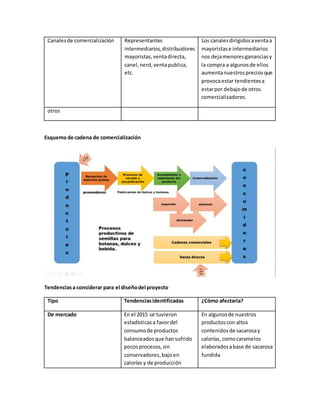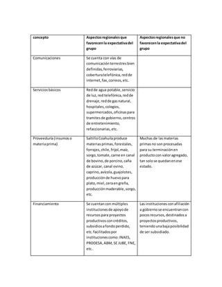 El documento describe varios factores regionales que podrían favorecer o no el éxito de un grupo empresarial. Entre los factores positivos se encuentran buenas vías de comunicación, servicios básicos, proveeduría de materias primas y acceso a financiamiento. Sin embargo, también existen desafíos como la falta de procesamiento de materias primas, pocos recursos para subsidios y canales de comercialización que reducen las ganancias. El documento analiza tendencias de mercado, económicas, jurídicas, políticas y sociales que