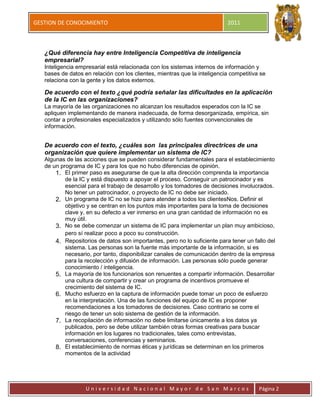 El documento habla sobre la importancia de la inteligencia competitiva (IC) para las organizaciones. Menciona que la IC involucra la recolección ética y sistemática de información relevante del entorno externo para apoyar la toma de decisiones estratégicas. También discute las diferencias entre IC e inteligencia empresarial, así como las directrices clave para implementar con éxito un sistema de IC, como contar con el apoyo de la alta gerencia y definir objetivos claros.