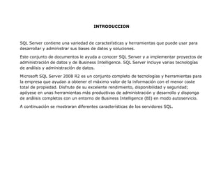Este documento describe las características y especificaciones de las diferentes ediciones de Microsoft SQL Server 2008 R2, incluyendo las ediciones Enterprise, Standard, Web, Express y otras. Detalla las capacidades de cada edición en áreas como escalabilidad, disponibilidad, seguridad, replicación, virtualización, desarrollo, administración y más.