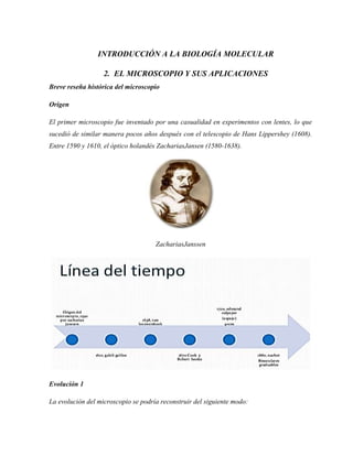 Este documento presenta una introducción al estudio de la biología celular. Cubre temas como el microscopio y sus aplicaciones, la citología y la teoría celular, la organización estructural y funcional de las células, y la reproducción celular. Explica conceptos clave como la definición de célula, los postulados de la teoría celular, las diferencias entre células eucariotas y procariotas, y los procesos de mitosis y meiosis.
