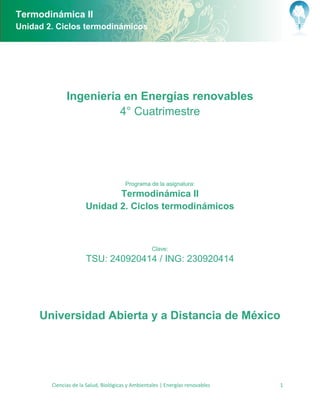 Este documento presenta la unidad 2 sobre ciclos termodinámicos de un curso de termodinámica II. La unidad analiza ciclos de potencia como ciclos de gas y vapor, así como ciclos combinados. También cubre ciclos de refrigeración como sistemas de refrigeración de vapor y gas. El objetivo es que los estudiantes puedan analizar y diseñar sistemas industriales que usen estos ciclos termodinámicos.