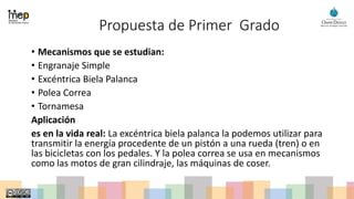 Este documento presenta propuestas educativas para diferentes grados escolares sobre mecanismos robóticos. Propone estudiar mecanismos como engranajes, palancas, poleas y cremalleras, y cómo simular su funcionamiento para crear movimientos como de animales, máquinas y más. También incluye aplicaciones de los mecanismos en la vida real y reflexiones sobre logros y desafíos del aprendizaje sobre robótica a través de la construcción de mecanismos.