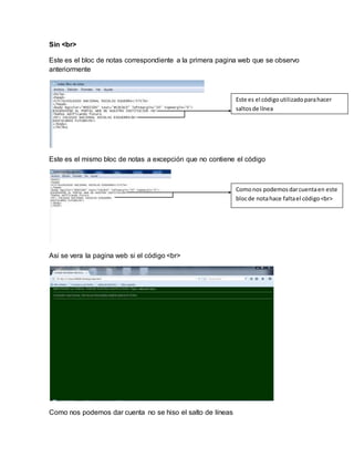Este documento describe cómo los códigos HTML opcionales <br> y <hr> afectan la apariencia de una página web básica. Usa ejemplos de código con y sin estos elementos para mostrar que <br> salta líneas y <hr> agrega separadores. Muestra cómo la página se ve sin estos códigos y explica su propósito.
