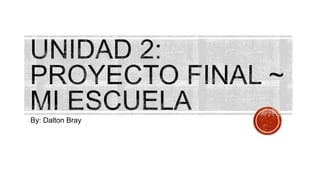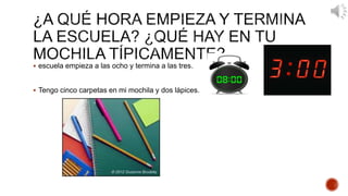 El documento describe la rutina escolar de Dalton Bray. Detalla su horario de clases, incluyendo historia, psicología y español. Dalton toma notas, responde preguntas y aprende cosas nuevas en todas sus clases. Su clase favorita es el segundo período porque le gusta su maestra y hay pupitres y computadoras. Dalton pregunta sobre las clases favoritas, actividades y contenidos típicos de las mochilas de otros.