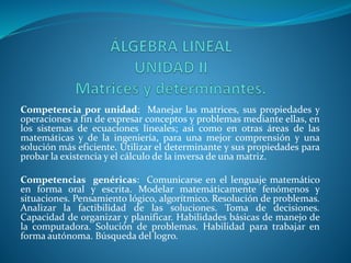 Este documento trata sobre las competencias genéricas y específicas relacionadas con las matemáticas. Describe habilidades como comunicarse usando lenguaje matemático, modelar fenómenos matemáticamente, pensamiento lógico y resolución de problemas. También cubre el manejo de matrices, sus propiedades, operaciones y tipos especiales como vectores y matrices cuadradas.