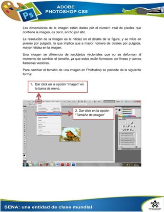 Este documento describe cómo editar imágenes en Photoshop, incluyendo ajustar el tamaño, cambiar el tamaño del lienzo y aplicar transformaciones. Explica que al cambiar el tamaño de una imagen es importante considerar factores como la resolución y el formato, y que existen imágenes rasterizadas y vectoriales. También detalla los pasos para rotar e invertir una imagen usando las herramientas de transformación.