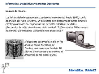 El documento resume la evolución de los dispositivos de almacenamiento de información desde 1947 hasta la actualidad, comenzando con el Tubo Williams de 500-1000 bits y la Memoria de Tambor de 10 KBytes, luego los diskettes de 1.2 MB y los primeros discos duros de 1 GB, el CD de 700 MB, y actualmente los pen drives y memorias flash externas de gran capacidad como 32 GB.
