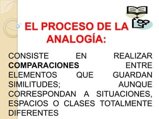 El documento describe los conceptos de analogía y comprensión analógica de la lectura. Explica que la analogía implica comparar elementos que comparten similitudes a pesar de pertenecer a situaciones diferentes. Se define la analogía como una relación de semejanza entre dos cosas distintas. Además, detalla los procedimientos para completar analogías y comprender profundamente la lectura mediante el análisis de analogías e inferencias.