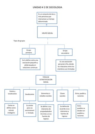 La unidad 2 de sociología cubre varios temas clave como los tipos de grupos sociales, la estratificación social, los actores ciudadanos, la movilidad social, los movimientos sociales y las organizaciones, la sociedad civil y las redes sociales. Explica conceptos como nacionalismo, cosmopolitismo y ciudadanía global. También analiza los movimientos indígenas y otros movimientos sociales históricos.