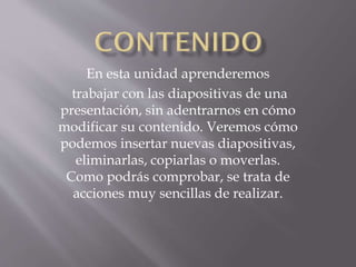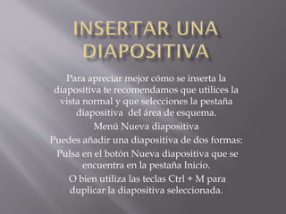 Este documento explica cómo insertar, eliminar, copiar y mover diapositivas en una presentación de PowerPoint. Se describen las diferentes formas de realizar estas acciones, ya sea utilizando los botones en la cinta, los menús contextuales, las teclas de acceso rápido o arrastrando las diapositivas.