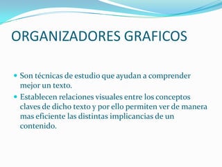 Los organizadores gráficos como mapas mentales, organigramas, diagramas de flujo ayudan a comprender mejor un texto al establecer relaciones visuales entre conceptos claves. Programas como MindManager, Visio y SmartArt en Microsoft Office permiten crear diferentes tipos de organizadores gráficos de manera fácil. PowerPoint también es útil para crear presentaciones con esquemas y animaciones.