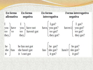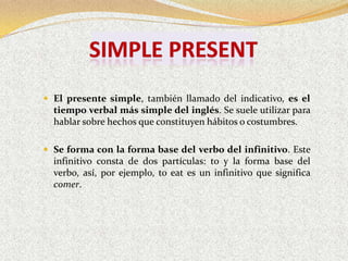 El documento resume los tiempos verbales y estructuras condicionales en inglés. Explica el presente simple, presente continuo, pasado simple, pasado continuo, pretérito perfecto, pretérito pluscuamperfecto y oraciones condicionales de tipo A, B y C. Proporciona ejemplos y explica la formación de cada tiempo verbal y estructura condicional.