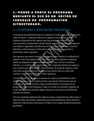 El documento describe los pasos para editar y compilar un programa mediante el uso de un editor de lenguaje de programación estructurado. Explica cómo capturar video, importar clips, añadir transiciones, efectos, títulos y audio. También cubre cómo compilar el programa para depurar errores, ejecutarlo y guardar el proyecto final.