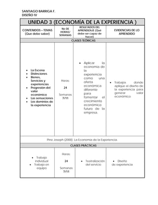 Este documento presenta la unidad 3 de un curso de Diseño IV sobre la economía de la experiencia. La unidad cubre temas como la escena, las distinciones, los bienes, servicios y experiencias, y la progresión del valor económico. Los estudiantes aprenderán a aplicar la economía de la experiencia para ofrecer una nueva oferta económica y fomentar el crecimiento futuro de las empresas.