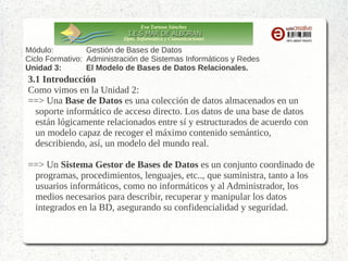 El documento aborda el modelo de bases de datos relacional, detallando su estructura y elementos, así como las operaciones de álgebra relacional y restricciones necesarias para garantizar la integridad de los datos. Se enfatiza la importancia del modelo relacional para la organización de datos en aplicaciones de gestión empresarial y se explica la distinción entre modelos relacionales y no relacionales según las necesidades de manejo de datos. Además, se exploran las claves primarias y foráneas, junto con ejemplos de su implementación en bases de datos.