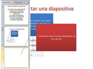 Este documento describe las funciones básicas para trabajar con diapositivas en PowerPoint, incluyendo cómo insertar nuevas diapositivas, seleccionar diapositivas, copiar y pegar diapositivas de otras presentaciones, duplicar diapositivas, mover diapositivas entre la secuencia, y eliminar diapositivas.