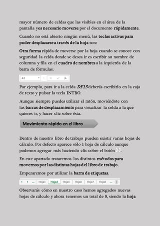Este documento proporciona instrucciones sobre cómo moverse rápidamente dentro de una hoja de cálculo de Excel y entre diferentes hojas. Explica los atajos de teclado para moverse entre celdas y hojas, así como cómo escribir direcciones de celdas para ir directamente a una ubicación. También cubre cómo introducir y modificar datos en celdas, incluidos números, texto y fechas, así como cómo lidiar con posibles errores.