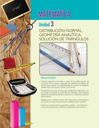 Este documento presenta los objetivos y contenidos de una unidad de matemáticas sobre distribuciones normales. Los objetivos incluyen tomar decisiones basadas en probabilidades de eventos usando distribuciones normales y proponer soluciones a problemas usando geometría analítica y resolución de triángulos. El contenido cubre características de distribuciones normales como simetría y áreas bajo la curva, así como ejemplos de cálculo de probabilidades y conversión a valores z.