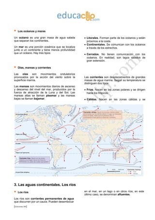 El documento describe los componentes de la hidrosfera, incluyendo los océanos, mares, ríos, lagos y aguas subterráneas. Explica que el agua se mueve continuamente a través del ciclo del agua entre los estados líquido, sólido y gaseoso. Además, distingue entre las aguas saladas que comprenden la mayor parte del agua del planeta en los océanos, y las aguas dulces que representan solo el 3% del agua total y se encuentran en los continentes, glac
