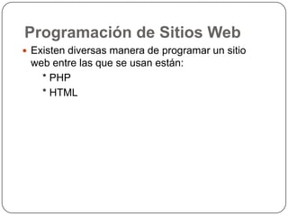 Este documento habla sobre programación de sitios web, mencionando que lenguajes como PHP y HTML se usan comúnmente. Explica que PHP es un lenguaje del lado del servidor que produce resultados en HTML para enviarlos al navegador del usuario. También menciona algunos requisitos para crear un sitio web como dominio, hosting, contenido y diseño. Brevemente describe la función del hosting y diferentes editores para PHP como Dreamweaver.
