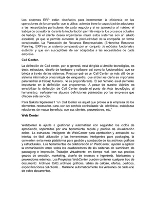 1. El documento describe varias tecnologías de integración como Internet, ERP, Call Center y Web Center que son importantes para las empresas porque facilitan la comunicación con clientes, proveedores y entre departamentos, permitiendo mejorar los procesos y la productividad.