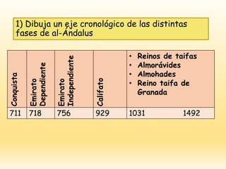 Este documento resume la historia de al-Ándalus desde la conquista musulmana en el siglo VIII hasta la caída del último reino musulmán en Granada en 1492. Incluye las distintas fases como el Emirato Dependiente de Damasco, el Emirato Independiente de Córdoba establecido por Abd al-Rahman I, el Califato de Córdoba bajo cuyo mandato alcanzó su máximo esplendor, los reinos de taifas posteriores a su desintegración, y los imperios norteafricanos de los