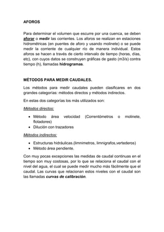 El documento describe los métodos para medir caudales en ríos, incluyendo métodos directos como el método área-velocidad usando molinetes, y métodos indirectos usando estructuras hidráulicas. Las mediciones de caudal se usan para construir curvas de calibración e hidrogramas que muestran la variación del caudal con el tiempo, y son fundamentales para el diseño de obras hidráulicas.